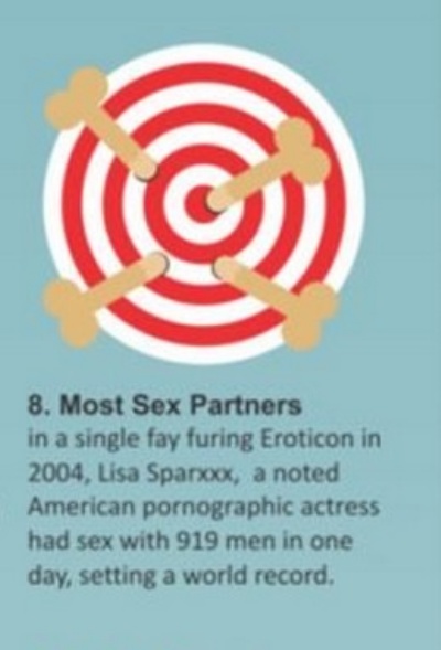 Lisa Sparxxx (born October 6, 1976) is a noted American pornographic actress. She had sex with 919 guys in a single day, setting a world record. Specifically, it occurred during Eroticon 2004, a Polish convention that celebrates exactly what its title suggests, as part of the Third Annual World Gangbang Championship. This wasn’t just some publicity stunt either; the coveted “World Gang Bang Record” had changed “hands” back in 2002 and 2003, when the number reached was 646 and 759, respectively.