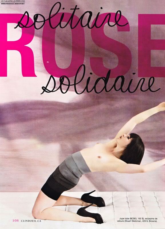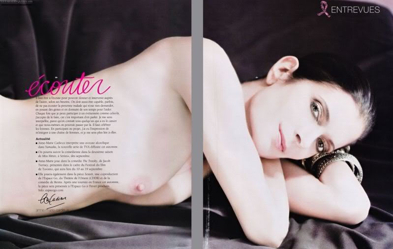 Le magazine Clin d’oeil et la porte parole Anne-Marie Cadieux ont présentés 13 comédiennes et chanteuses québécoises qui ont eu le courage de poser seins nus pour la fondation du cancer du sein. Les femmes ayant posés ce défis sont Karine Vanasse, Mélanie Maynard, Caroline Néron, Sophie Cadieux, Julie Ménard, Anne-Marie Losique, Amélie B. Simard, Catherine Yale, Marie-Johanne Boucher, Marie-Luce Béland, Élizabeth Dupéré et Caracol.