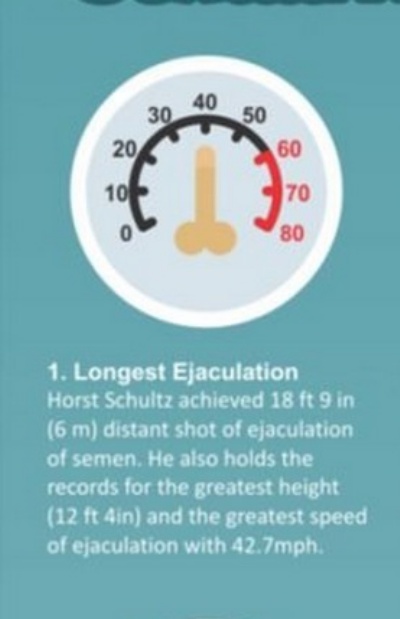 The farthest male ejaculation ever recorded was 18’9″ (5.71 m) and was achieved by Horst Schultz from USA. He also holds the records for the greatest height (12 ft 4in) and the greatest speed of ejaculation, or muzzle velocity, with 42.7mph.