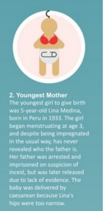 The youngest girl to give birth was 5-year-old Lina Medina, born in Peru in 1933. Incredibly this girl began menstruating at age 3, and despite being impregnated in the “usual” way, has never revealed who the father is. Her father was arrested and imprisoned on suspicion of incest, but was later released due to lack of evidence. The baby was delivered by caesarean because Lina’s hips were too narrow.
